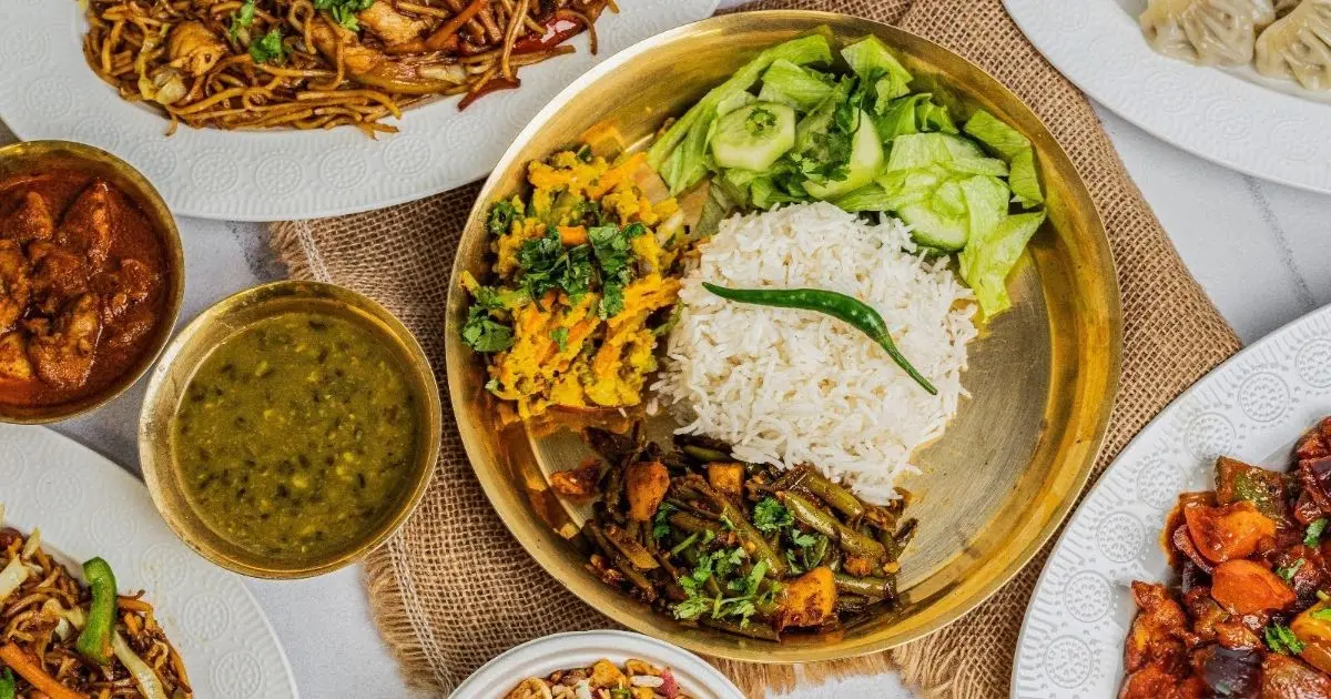 Nepalese style fried noodles with vegetables, paneer (cottage cheese, brown chickpeas and spices, cabbage, comes with tomato pickle